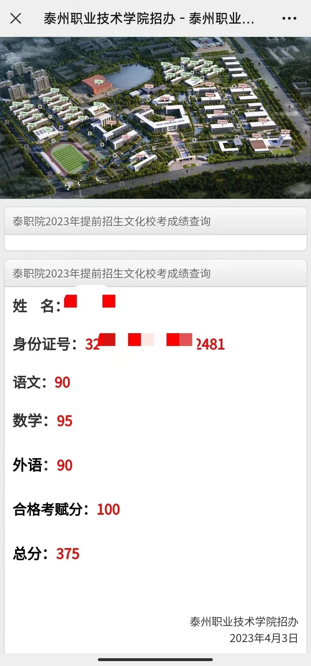 点击“查询”即可获取泰州职业技术学院2023年提前招生第一轮校考成绩。