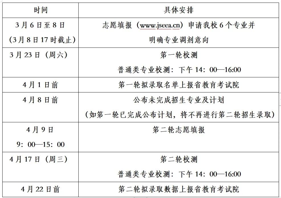 志愿填报时间:2024年3月6日至8日(截止时间为3月8日17时),考生登录省教育考试院(www.jseea.cn)的高职院校提前招生申请平台,根据合格性考试成绩,结合我校公布的报考条件和专业计划等,向我校提出申请,考生可向我校申请6个专业并明确专业调剂意向。
