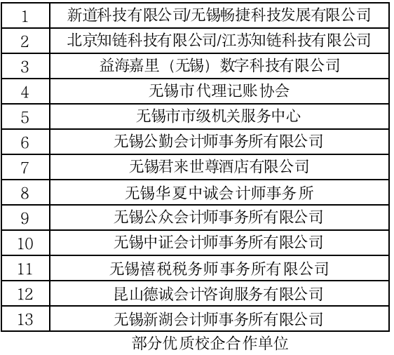 与无锡代理记账协会、无锡市级机关服务中心等四十余家单位建立全面合作关系,探索“1+N”实践基地建设,为学生提供大量专业对口的优质实习和就业岗位。