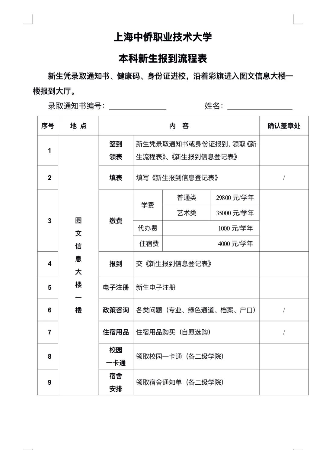 递交:填写后的《新生报到信息登记表》