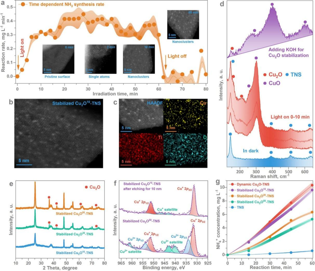 本研究首先将Cu2+和还原糖(甲醛,HCHO)这一氧化还原对引入到光合作用系统中,利用光诱导伪斐林路线完成了高分散动态Cu2O亚纳米团簇(NCs)的现场构建(图1)。分别利用光产生的电子(e−)和空穴(h+),将Cu2+还原为Cu2O, HCHO氧化为甲酸(HCOOH),并形成了Cu2O NCs和构建了Cu2O- TNS界面。HCHO到HCOOH的氧化反应作为氧化途径具有经济竞争力,可实现污染物的增值转化。与此同时,在动态Cu2O活性位点上,硝酸盐(NO3−)到NH3的光合作用得到了极大地促进,实现了里程碑式的效率,包括合成率(1.98±0.04 mol gCu−1 h−1 或 42.64±0.81 mmol gcat−1 h−1)、NO3−转化率(94.2±0.91 %)和 NH3选择性(98.6±0.55 %)等总体目标。NH3作为一种最基本的化合物和重要的储能介质,对低碳高效合成具有重要意义。通过使用亚硝酸盐(NO3−)和氧化氮(NO)等不同的氮原料,也验证了Cu2O同步构建对 NH3 光合作用的促进机制。