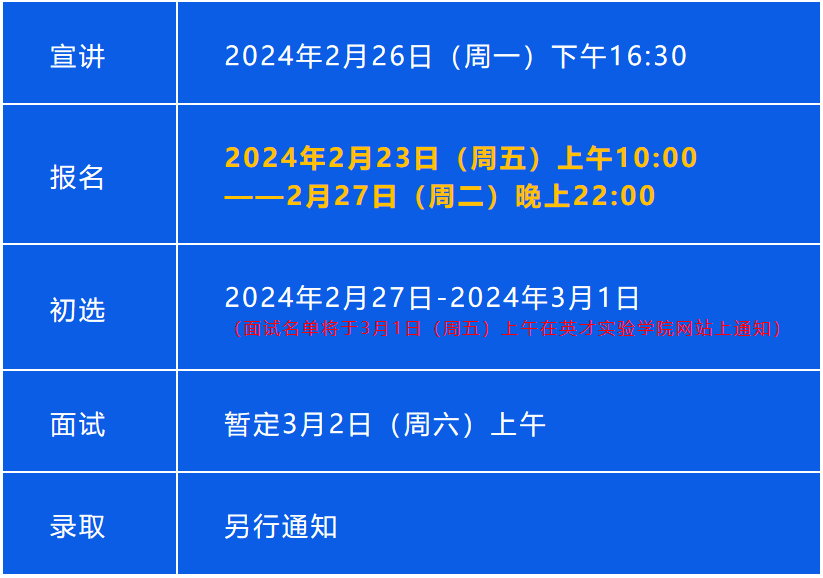 (面试名单将于3月1日(周五)上午在英才实验学院网站上通知,请相关同学给予关注。)