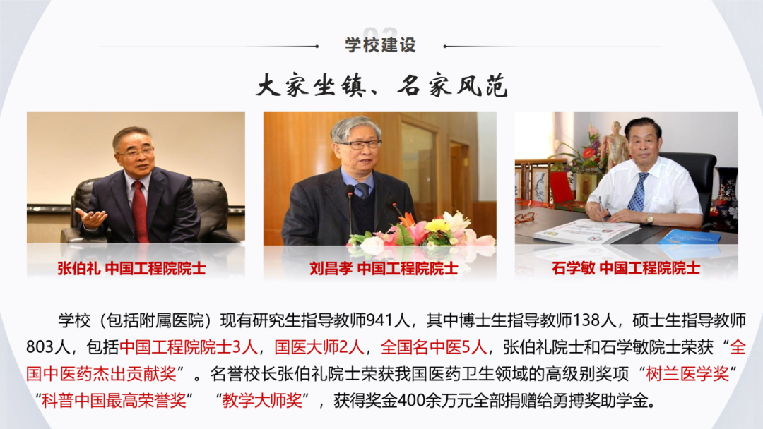 本次宣讲活动,我们以疫情中中医药发挥的重大作用为切口,首先给同学们展示了中医药的疗效,给同学们展示了一幅中医药发展的栩栩画卷,让同学们对我国中医药良好的发展前景有一定的了解。其次,我们展示了天中的办学优势以及办学特色,包括但不限于三位院士坐镇、良好的实践环境、办学专业齐全等,重点介绍了传承班与勇博励志班,给同学们介绍了这些办学制度的意义与优势。我们还为同学们解析了天中在浙江的招生政策与招生条件,从学生的角度来为其解答报考事宜,让学子能够自主思考与