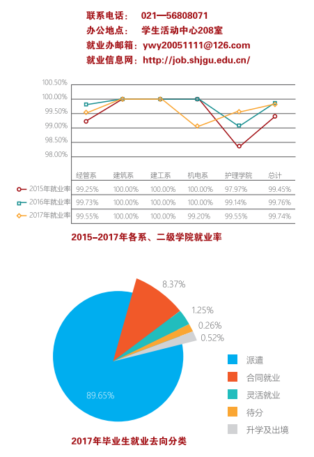 上海市区域经济的飞速发展,为广大学生就业提供了极大的保障。学院近三年来毕业生就业率始终保持在99%以上,位居同类院校前列。毕业生就业去向为上海市各大