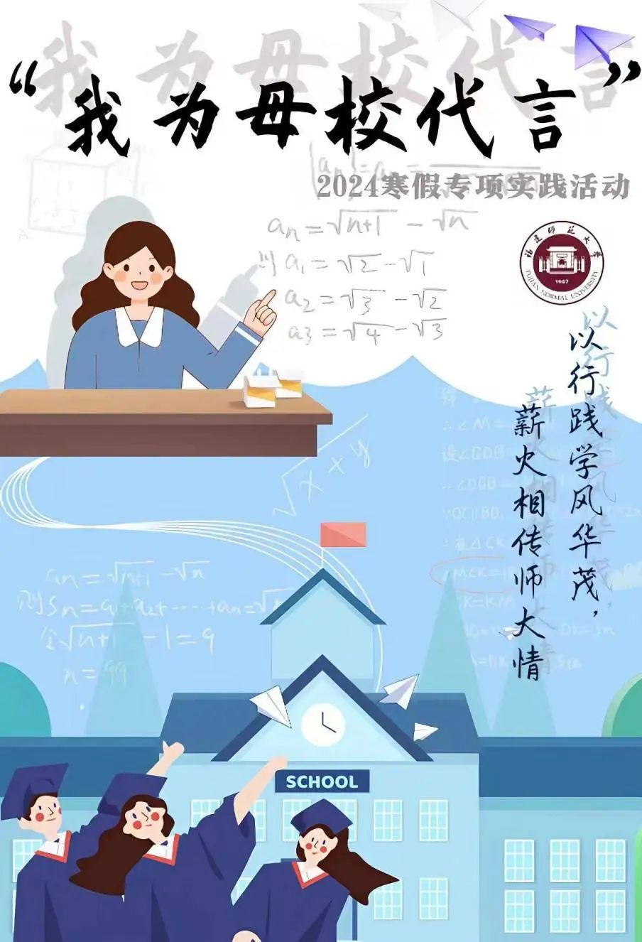 2024年寒假已结束,新学期的钟声已然响起,有这样一群师大学子,他们的热情并未因冬日的寒风凌冽而熄灭,在归乡的喜悦之余,他们利用寒假,重返高中校园开展“我为母校代言活动”实践活动,为母校学子点亮求学之路,将师大的过去和现在伏笔于学弟学妹们的未来。师大er们为母校代言的故事是一个个温情有爱的篇章,且听他们娓娓道来。01“情系母校,筑梦福师”社会实践队