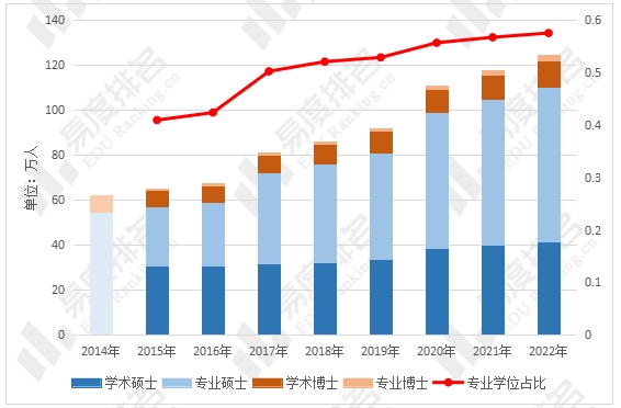 教育部最新文件显示,将继续提升专业学位研究生比例,到2025年我国硕士研究生招生中硕士专业学位研究生占比将达到66%左右,同时将大幅增加博士专业学位研究生的招生数量。2022年我国硕士研究生招生中硕士专业学位研究生占比已达62.5%。