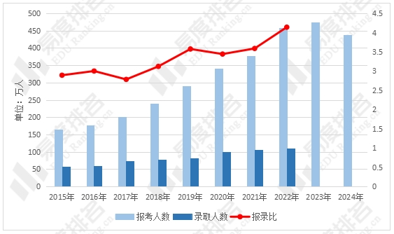 图 1 2015-2024年硕士研究生报考人数及录取人数