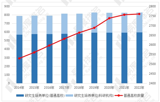 图 3 2014-2022年我国普通高校数量及研究生培养单位数量