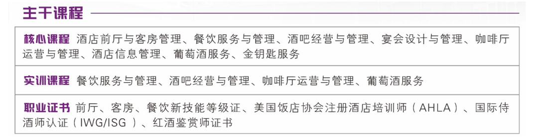 与企业共建东湖酒店产业学院,校企共同培养面向高星级酒店、文化主题酒店、精品酒店、国际豪华邮轮、国内游轮游艇等旅游接待业,从事酒店VIP接待服务、高端客户私人订制管家服务等高级岗位工作的高素质技术技能人才。