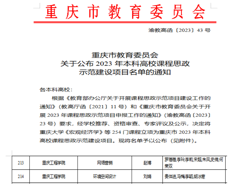 我校2门课程立项为重庆市2023年本科高校课程思政示范建设项目 根据《教育部办公厅关于开展课程思政示范项目建设工作的通知》(教高厅函〔2021〕11号)和《重庆市教育委员会关于开展2023年课程思政示范项目申报工作的通知》(渝教高函[2023]23号)要求,近日,重庆市教育委员会公布了2023年本科高校课程思政示范建设项目名单,经学校推荐、资格审查、专家评议及公示,决定将254门课程立项为重庆市2023年本科高校课程思政示范建设项目。其中我校管理学院老师赵博带队申请的《网络营销》、建筑工程学院老师刘婧带队申请的《环境空间设计》两门课程成功立项为重庆市2023年本科高校课程思政示范建设项目。