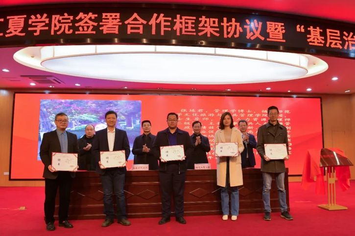 宋建晓、程强分别致辞。校政双方签署了合作框架协议,为研究中心揭牌,并向来自地方和高校的5位基层治理研究专家颁发“特约研究员”聘书。