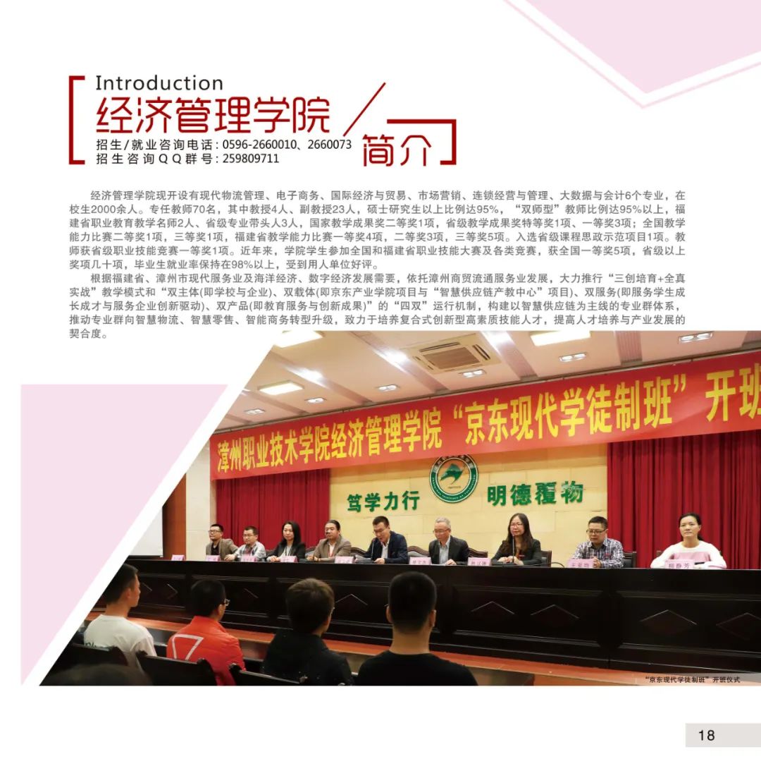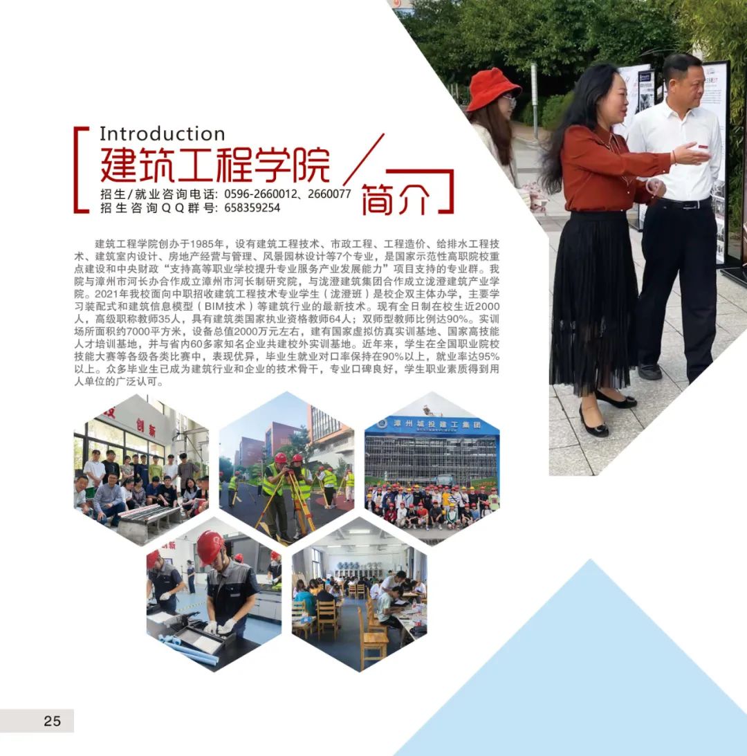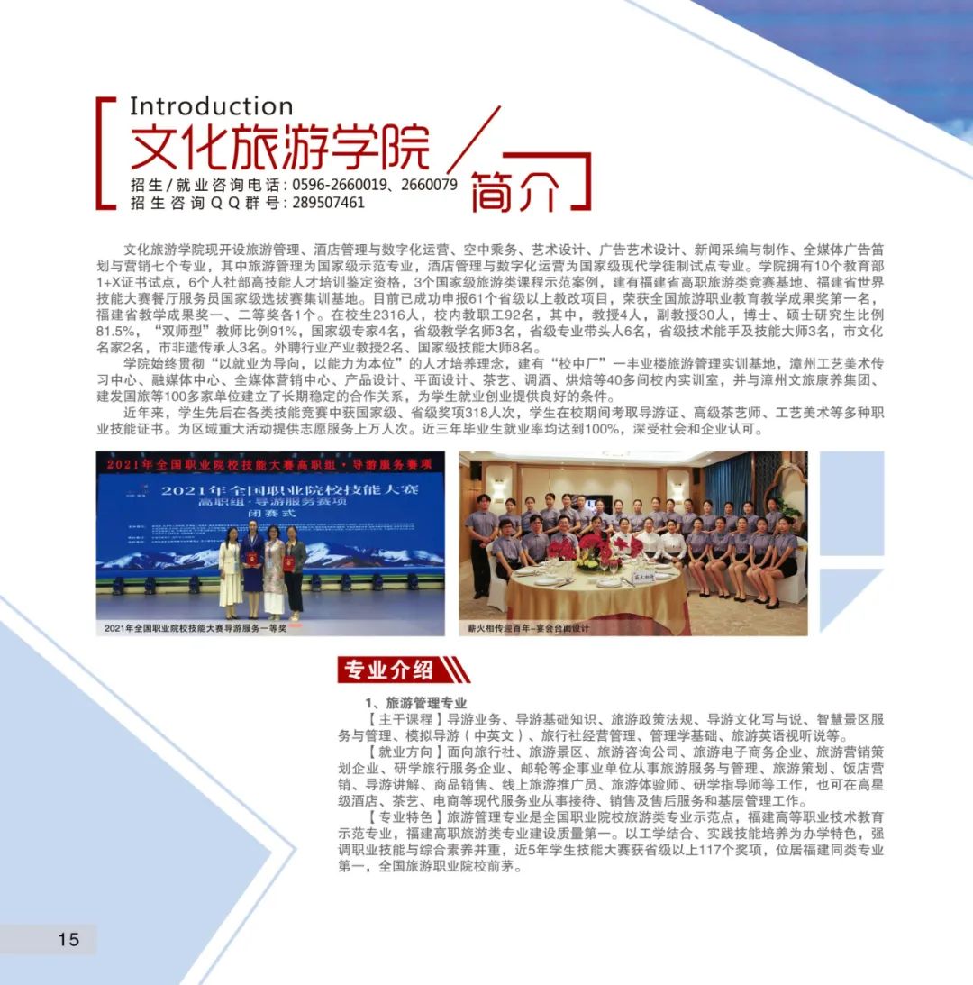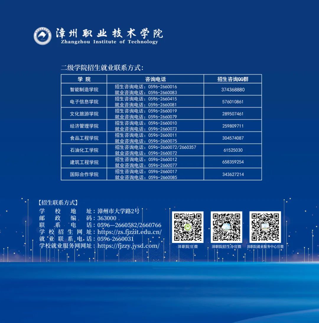 点击下方"链接"了解更多信息!漳州职业技术学院2023年普通高考分省分专业招生计划(附我校2022年福建省普通高考录取分数线)漳州职业技术学院2023年普通高考招生章程@考生 相约漳职院 共筑未来梦学院风采---“经”世致用,“管”奏华章|经济管理学院学院风采---崇责覃械 匠心融智 | 智能制造学院学院风采---向阳而生 追求卓越|文化旅游学院学院风采---EI引领时代 畅游无限未来 | 电子信息学院END