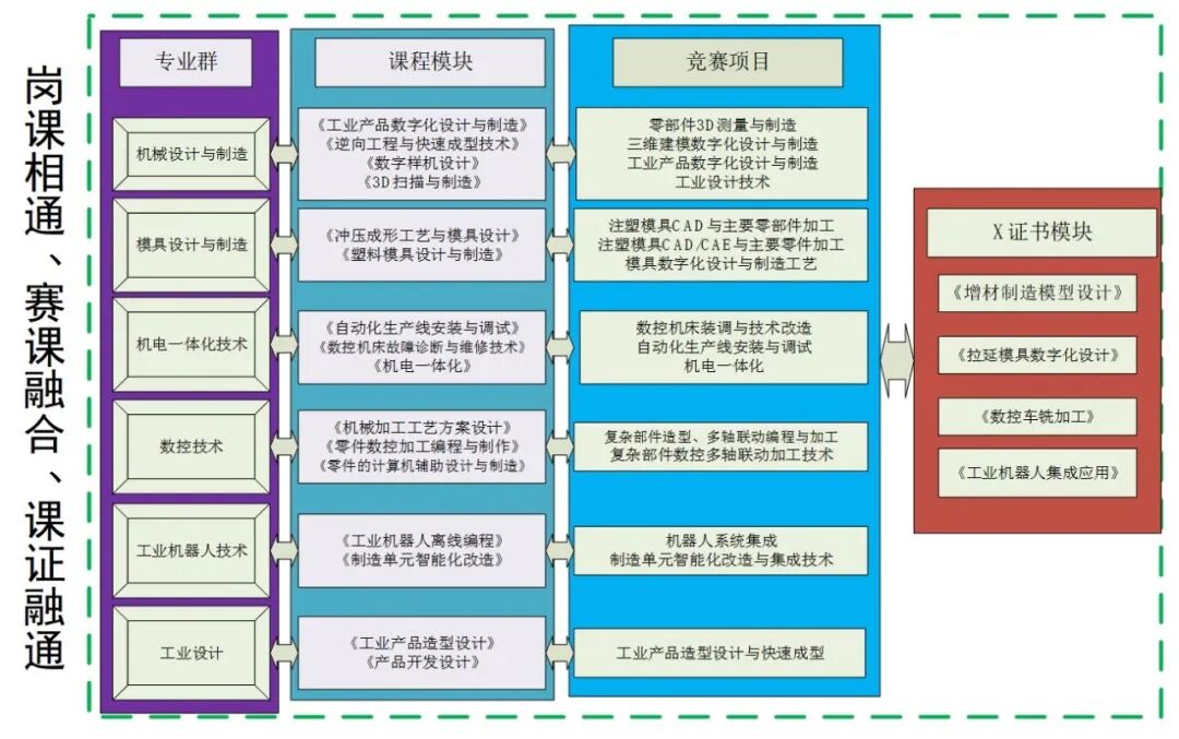 以专业群对接产业链,以课程群对接岗位链,依据“全课教育+实践融入”理念,解构装备制造相关岗位知识、技能需求,课赛融合、课证融通,深化岗课赛证研创一体化体系。以装备制造大类竞赛为引领,将竞赛项目融入人才培养,主动适应赛项演变,融入课程开发,组建兴趣小组并参加对应的比赛项目。2013年开设实施岗课赛融通模式以来获得获得国赛一等奖2项、二等奖4项、三等奖2项,国家级行业赛一等奖3项,成绩名列福建省制造类专业前茅。
