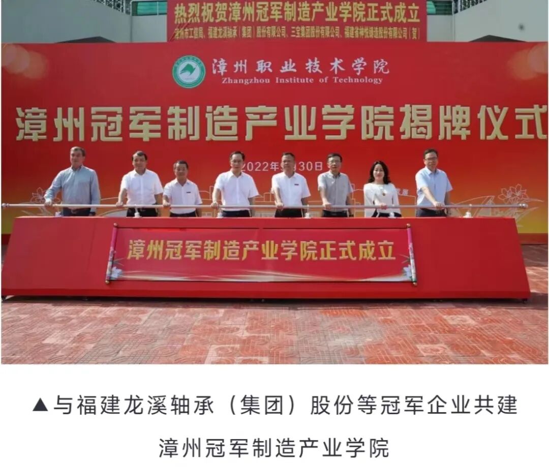 以产教融合、校企合作为基础,提升人才培养质量。牵头成立的漳州智能制造职教集团入选2022年福建省示范性职业教育集团,作为福建省机械制造行业职业教育指导委员会秘书长单位,专业群与漳州市应急管理局共同成立漳州市应急管理学院,现建有省级试点产业学院-戴姆勒大中华-福建汽车职业教育产业学院,与神悦铸造共建神悦科技学院、与东刚精机共建省级闽台精密机械制造公共服务平台,与三宝集团共建三宝科技学院、与福建龙溪轴承(集团)股份等冠军企业共建漳州冠军制造产业学院,不断提升人才培养质量。