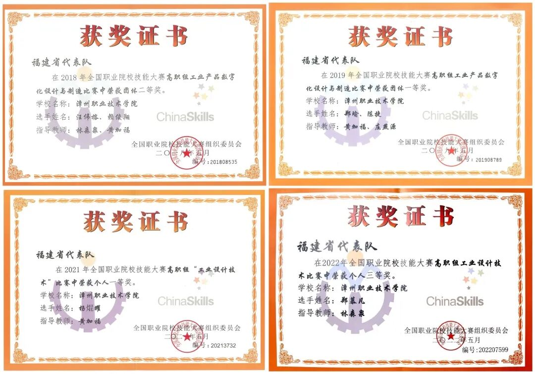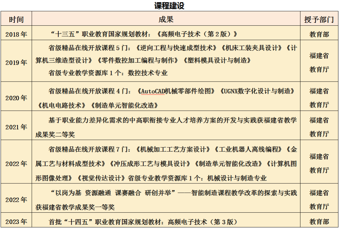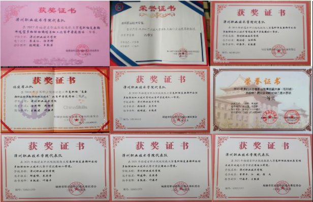 机械设计与制造专业团队开发出“福建省中高职衔接专业指导性人才培养方案”,成为教育厅向福建省内职业院校推广的指导性文件,围绕本专业为主体的专业建设获得教学成果奖省级一等奖1项、二等奖1项。专业的学生在全国、机械行指委、省技能比赛中成绩斐然,近五年,在国家和省级技能竞赛中获得10余项奖项,其中国家级一等奖5项、二等奖5项,省级一等奖4项。获评省级典型案例1项、入选省级专业资源库、3门获省级精品课程。