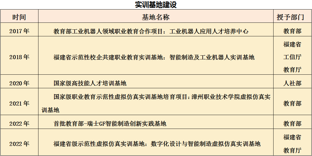 机械设计与制造专业群为福建省“双高计划”立项建设的高水平专业群。专业群虚拟仿真实训基地被纳入教育部立项的职业教育示范性虚拟仿真实训基地培育项目建设;机电一体化技术专业入选人社部国家高技能人才培训基地项目;机械设计与制造专业2019年被认定为全国骨干专业;2022年入选工信部人才交流中心产教融合试点专业建设。