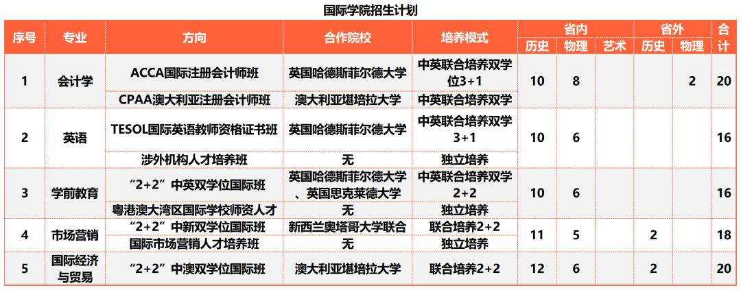 【专业特色】学生前两年在我校学习,后两年在澳大利亚合作院校学习。该专业主要是培养熟悉世界贸易组织运行机制、国际通行经贸规则及不同国家经济贸易法规和业务流程,系统掌握经济学、国际贸易学基本原理,熟练掌握外贸、销售、报关等业务流程和专业技能,并结合广交会的地方特色,开设与会展相关的课程,服务粤港澳大湾区,致力于培养具有全球视野和较强创新意识和英语应用能力的应用型、复合型、国际化人才。【主要课程】国际贸易专业导论(Introduction to International Trade)、国际经济学(International Economics)、国际贸易实务(International Trade Practice)、外贸业务综合模拟(Integrated Foreign Trade Business Simulation)、跨境支付与结算(Cross-border Payments and Settlements)、国际商务谈判(International Business Negotiation)、国际市场营销学(International Marketing)、会展实务(MICE Practice)、国际商务英语函电(International Business English Correspondence)、互联网+创业等,以及澳方开设的适应国际发展趋势的课程。【学位证书】学生完成我校与合作院校规定课程获得相应学分,可获得广州华商学院毕业证书及堪培拉大学的学士学位证书;符合学士学位授予条件的,可获得广州华商学院学位证书。【就业方向】政府涉外经济管理机构、外贸公司、外资企业、跨国公司与银行、国际贸易相关会展行业等,也可从事与外贸相关的会展、电商平台运营、跨境营销、外贸跟单和国际经济合作等领域工作。获得学士学位后,也可继续申读海外高校硕士学位。海外合作院校简介哈德斯菲尔德大学(University of Huddersfield)始建于1841年,是英国公立综合性大学。学校紧邻哈德斯菲尔德市中心,哈德斯菲尔德城位于英格兰中部著名的西约克郡,从学校乘坐火车去往伦敦仅需不到两个小时,交通便利;校园毗邻主要的购物场所,生活便利;校内现代化与十九世纪的建筑交相辉映,哈德斯菲尔德窄运河流经校园,风景优美。该大学是全英排名前5的为学生提供“三明治课程”的大学,在提供高质量教学的同时突出行业特色,通过实用性以及高学术标准的工作经验增强学生就业竞争力。学生可以在相关行业进行带薪实习并从中受益,毕业生就业率高。会计与金融专业排名全英第50位(THE GUARDIAN 2022);大学毕业生任职CEO的数量居全球第89位(MINES PARIS ECH 2007);5%研究居世界优秀或领先水平(RESEARCH ASSESSMENT EXERCISE 2008);教学及教师质量全英前10(THE STUDENT EXPERIENCE SURVEY 2008)。 思克莱德大学(University of Strathclyde)始建于1796年,坐落于英国苏格兰格拉斯哥市,是世界一流公立研究型大学,苏格兰最大的师范教育高校,享有良好的学术声誉。学校师资力量雄厚,配备先进的教学设备,在创新和研发方面处于领先地位。在《泰晤士报》与《星期天泰晤士报》2021年优秀大学指南中,思克莱德大学教育学专业在英国排名第三。思克莱德商学院(SBS)是欧洲最大的商学院之一,是获得EQUIS、AMBA和AACSB “三重认证”的商学院之一,位列金融时报欧洲商学院排名第51位,英国第12位。本科入学平均成绩(UCAS)位列全英前五;2019年《泰晤士高等教育》评比中,思克莱德大学第二度荣膺英国年度大学奖。堪培拉大学(University of Canberra)是一所以就业为导向的综合类实践型大学,英联邦大学协会成员。泰晤士高等教育世界大学排名全球前1%(全澳前10),就业能力排行全澳前8。堪培拉大学的商科本科会计专业课程经澳大利亚CPA认证和澳大利亚新西兰Charted Accountants认证。学校位于澳大利亚首都堪培拉,环境舒适,交通便利。学校的教学宗旨是培养学生的职业能力,注重课程的实用性,堪培拉大学毕业生的就业能力稳居全澳前8,全球就业能力排名第156位。在堪培拉大学学习,学生可以享用澳大利亚首都的文化研究设施,如:国家图书馆、国家博物馆、国家档案馆、国家统计局等,堪培拉是澳大利亚非常方便、安全、适合居住和学习的城市之一。奥塔哥大学(University of Otago)位于新西兰南岛奥塔哥省首府达尼丁市,为新西兰最古老的大学,是新西兰第一所大学,是英联邦大学协会成员,是一所拥有超过200门本科及研究生课程的综合性大学。2022年QS世界大学排名位列194,学校有14个专业名列全球前100,商学院在全球排行榜中位列前1%。在新西兰国家教学优秀奖项中,获得7个最高奖项,数量位居新西兰首位。2019年奥塔哥大学荣获国际教育质量测评最高分;在2017年国际学生满意度调查排行榜中,位列新西兰榜首;2013年被《赫芬顿邮报》评选为世界16个最美大学之一。 学费说明国际学院学生收费标准为42000元/年,其中国际班学生在海外学习期间的费用按照海外相应高校标准收取,同时需按国际学院学费标准的80%缴纳学费。海外合作院校学费住宿费等费用可登录各高校官网查阅了解。以下网址为海外合作院校学费说明,数据截至2023年4月14日,仅供参考,实际学费请以海外院校当年录取通知书所列为准。海外合作院校2023年学费说明参考网址:①英国哈德斯菲尔德大学https://www.hud.ac.uk/international/fees-and-funding/②英国思克莱德大学