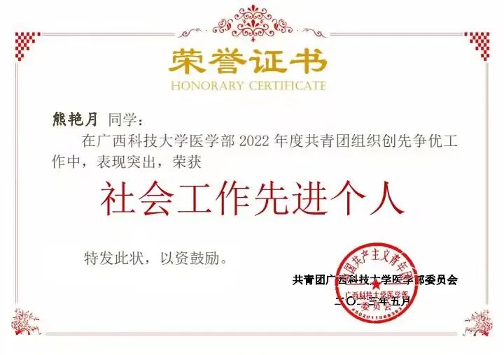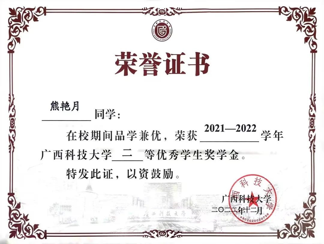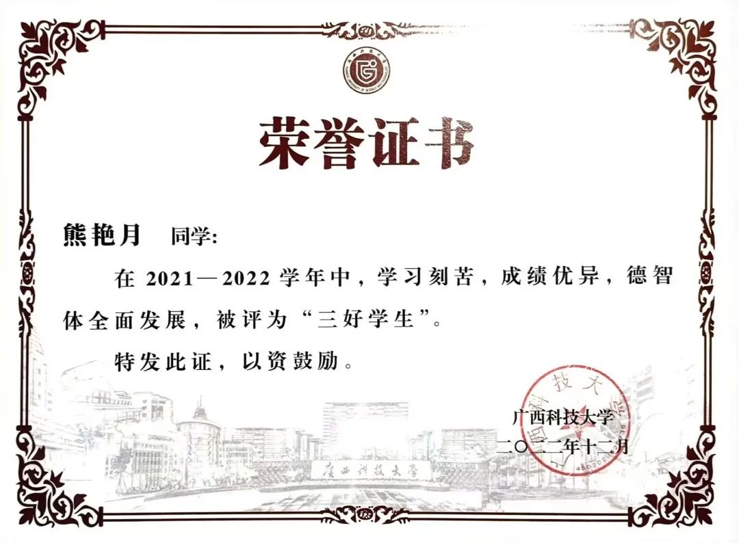 路虽远行则将至,事虽难做则必成。在挥洒汗水,努力耕耘过后,熊艳月的学习成果也让她的努力有了意义——获得自治区级奖学金,校级一等奖学金和校级二等奖学金。获得多项奖金后的熊艳月并没有因此而骄傲懈怠,而是怀着对自己未来负责的态度继续立足当下,同时还对未来做了规划。她想继续提升自我价值,希望能通过辛勤付出获得专升本的机会来提高学历。正如熊艳月的座右铭“不求一日成材,但求天天进步”,正所谓积土成山,积水成渊,都是一点一滴积累而成,每天的一小个进步都是未来的一大跨步的基础。