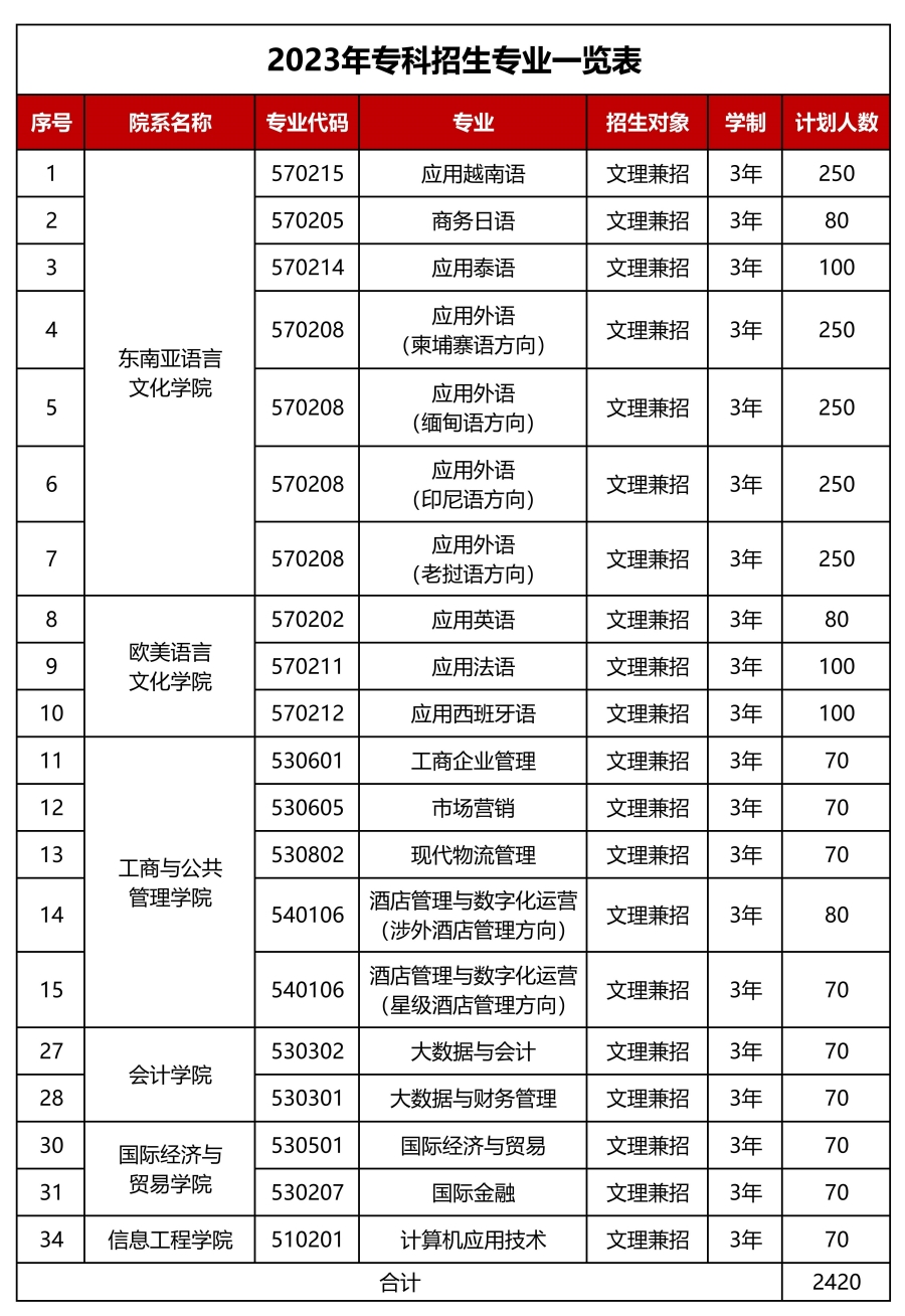 广西外国语学院2023年专科招生专业一览表 (学校代码:13830)