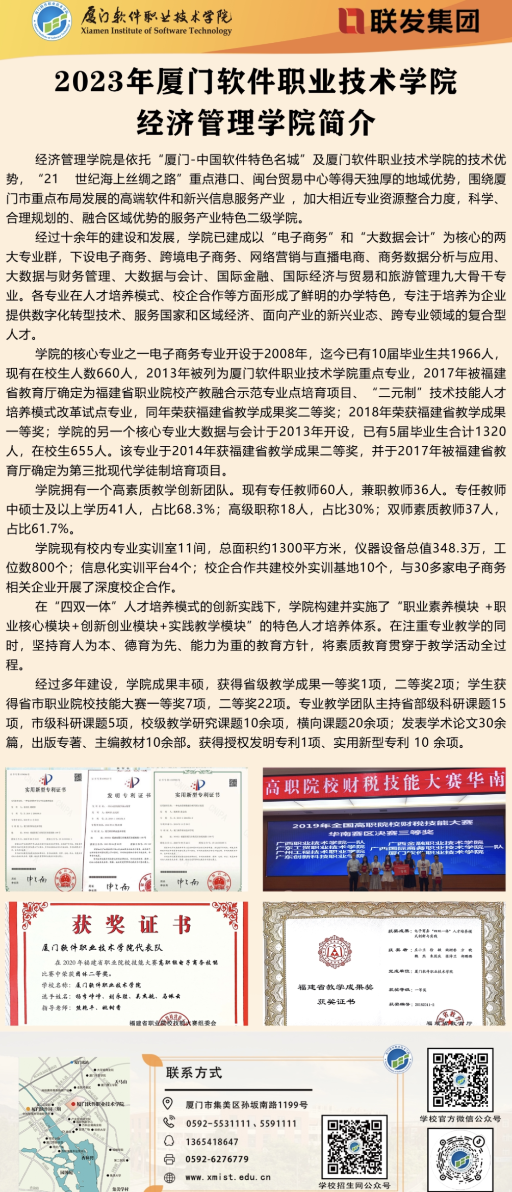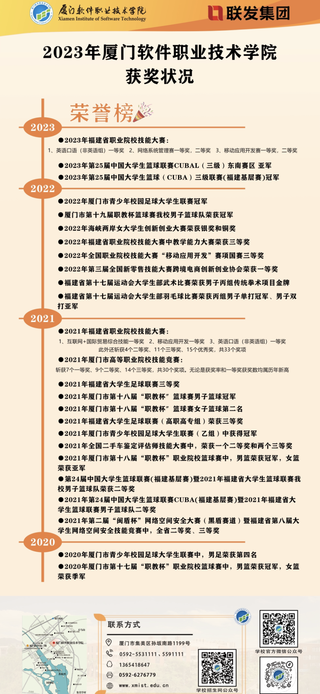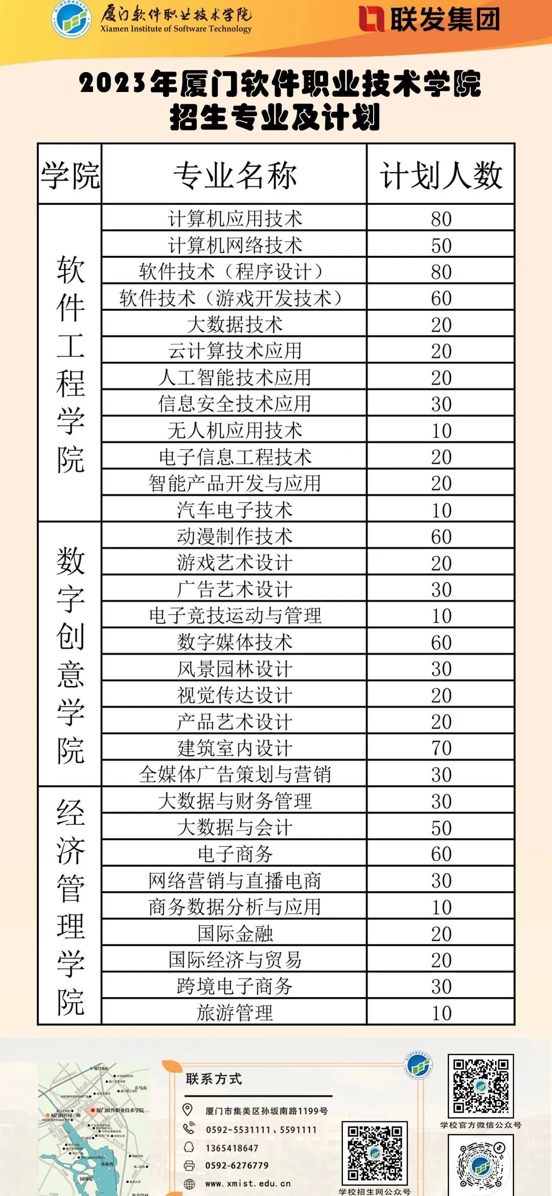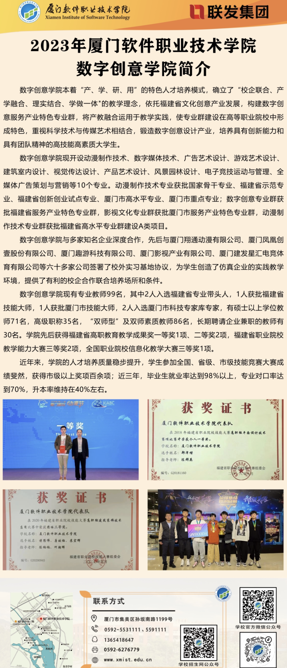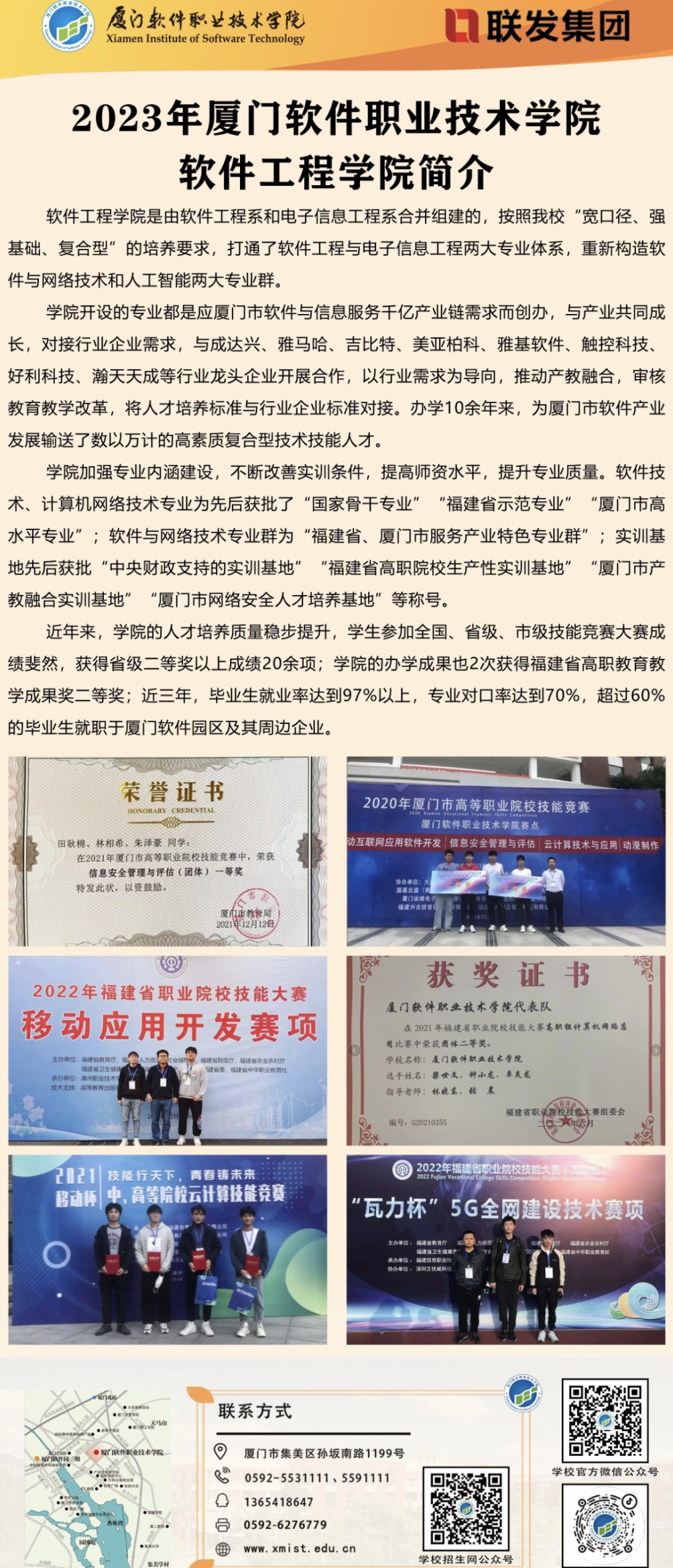 学校作为中国软件特色名城及厦门万亿产业软件园三期(共有软件企业数千家)的配套软件人才培养基地,毕业生就业前景广阔。同时,学校秉持产教融合,对接产业的教学模式,与国有企业厦门建发集团的子公司建发旅游集团、建发汽车有限公司等一大批知名企业开展全方位、深层次的人才培养合作,实施双主体育人,实习就业直通。我校历届毕业生双证书获取率高,近三年平均就业率达95%,专升本率同类院校中名列前茅。