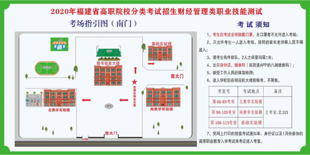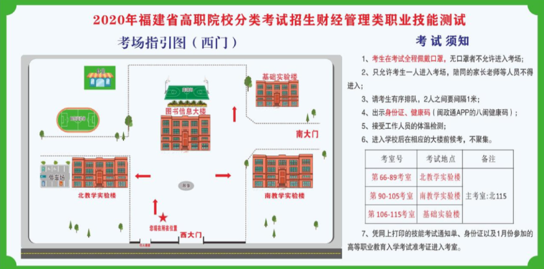 为了保障各位考生的安全,做好各项防疫工作,本次考试不允许考生家长、老师或其他与考试无关的人员及车辆进入考点。所有接送考生的车辆均要求停放在校外。校内会安排引导员指引考生到达考室。5.天气多变,携带雨具。
