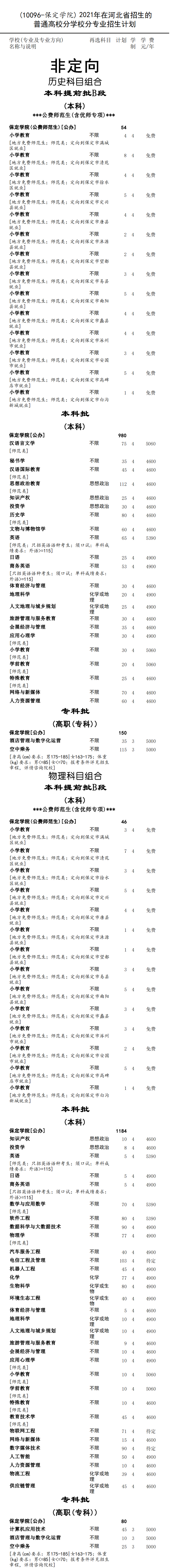 9、小学教育(公费师范生)本科专业,仅招收河北省生源考生,就读期间免除学费、免缴住宿费并补助生活费,入学后不得申请转学、转专业。学生入学前与学校和保定市相关县(市、区)政府签订编制核准计划内公费培养协议,毕业后全部面向保定市相关县(市、区)定向就业。