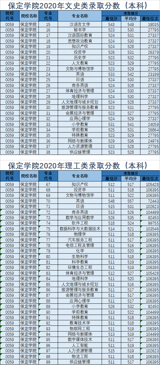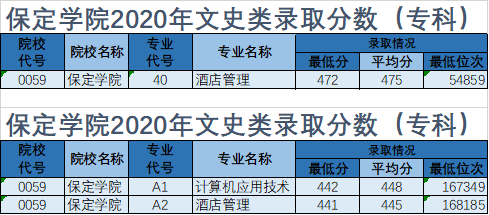 保定学院2020年专科录取分数