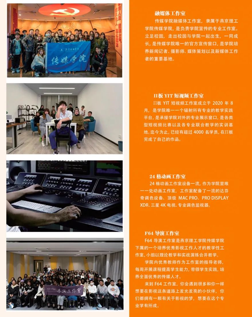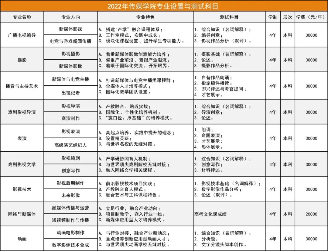 大北京、国际化、创新型传媒学院。我院位于京东地区,与北京行政副中心仅有一河之隔,是集传媒教育、产业和技术研发于一体的大型综合性产教生态共同体。学院现开设广播电视编导、摄影、播音与主持艺术、戏剧影视导演、戏剧影视文学、表演、影视技术、网络与新媒体、动画等本科专业。来到传媒学院,你就踏进了北京主流的传媒、教育产业圈。