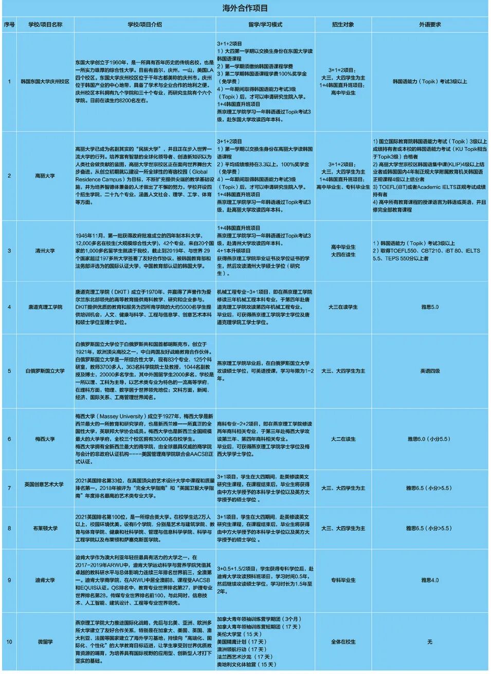 为满足学生高层次求学的个性化需求,培养具有国际化思维和全球化视野的精英学子,学校与全球200多所知名大学深度合作,打造了“本(专)硕直通”培养计划。在校学生完成本(专)科学业,达到与海外合作院校协定的入学条件,即可申请攻读硕士学位,100%实现海外升硕的学历提升目标,在燕理实现从本(专)科到世界名校硕士的华丽转身。