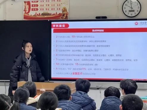 团队成员详细介绍了天师大的学科建设、师范教育、本科导师制以及丰富多彩的校园活动,得到了同学们的热烈反馈。