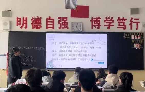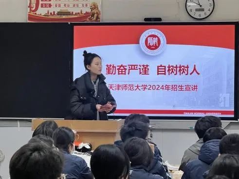 在母校老师的安排下,团队为高三文科九班的学弟学妹们进行宣讲。团队成员介绍了天师大的历史、校园文化和专业特色。详细的介绍了师大的招生政策、专业设置和校园生活。同时,团队还设立了问答环节,与学弟学妹们面对面进行交流。对师大充满好奇的同学,提出了许多关于大学生活和学习的问题。在这种专业性与趣味性结合的演讲中,让同学们对即将到来的大学生活充满了期待和信心。