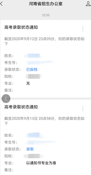 在录取期间,省招办将为考生发送个人最新录取状态变更信息,比如已投档、录取等。