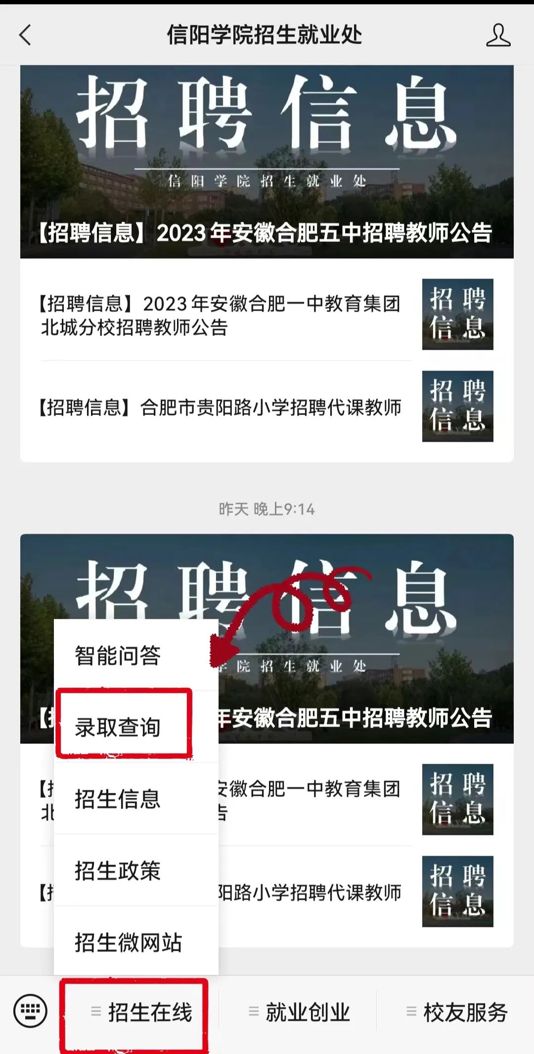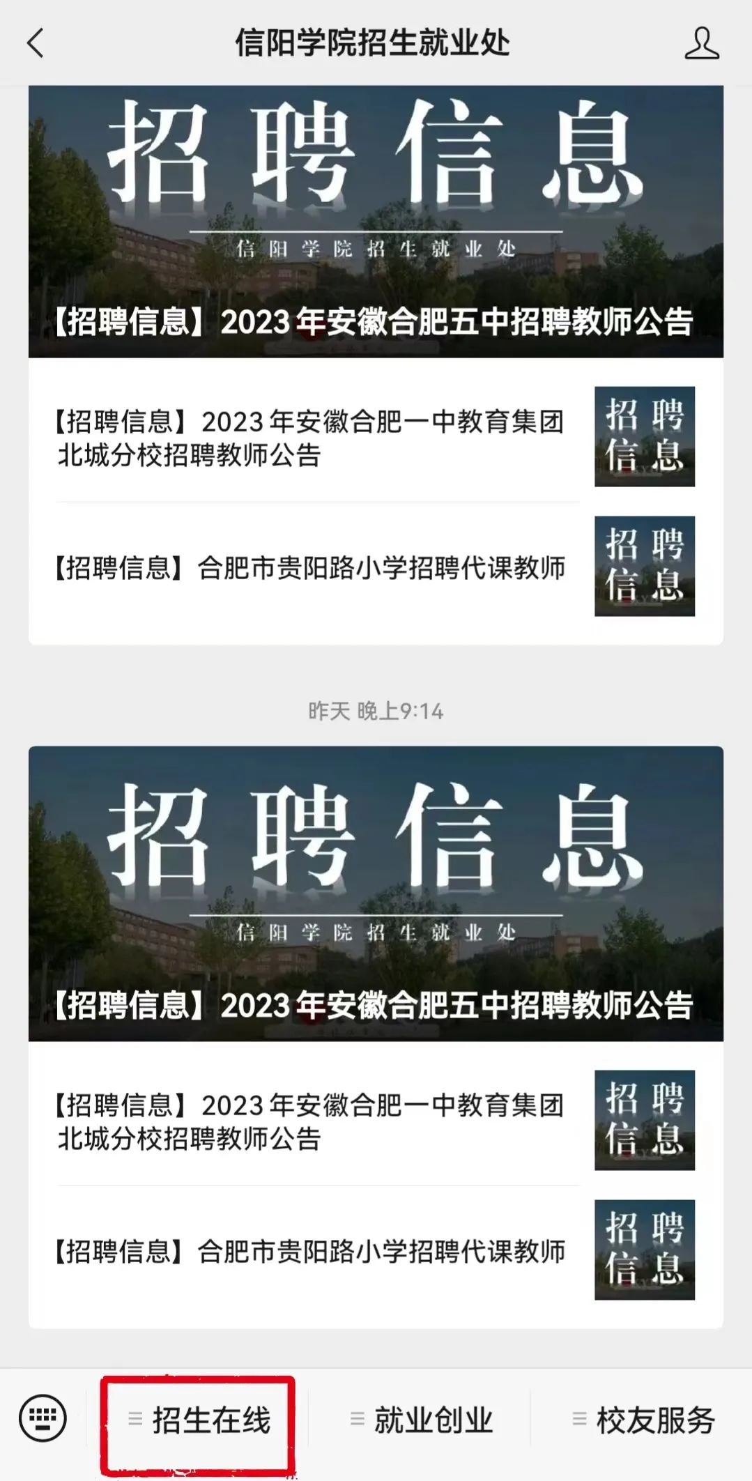 方法二:信阳学院招生就业处微信公众号第一步:关注信阳学院招生就业处微信公众号(微信号:hrxyzsjyb)→进入"信阳学院招生就业处微信公众号"→点击下方【招生在线】