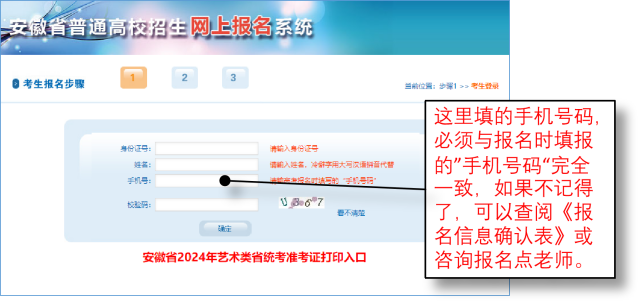 4. 登录系统报名需要填写高考报名时填报的“手机号码”,如果不记得了,可以查阅《报名信息确认表》或咨询报名点老师。