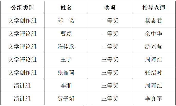 06湖南省大学生写作演讲竞赛11月24至26日,由湖南省教育厅主办的第八届湖南省大学生写作演讲竞赛在湘南学院举行,来自马栏山新媒体学院中文专业的9名同学参赛,与其他省内35所高校的300多名优秀选手同台竞技。经过激烈角逐,郑一诺同学以答辩最高分获得文学创作组一等奖,曹颖同学继上届比赛获文学创作组一等奖后,此次又获文学评论组一等奖;陈佳欣同学获得二等奖;王宇、张晶琦、李湘、贺子娟同学获得三等奖;我校喜获团体二等奖、优秀组织奖,在该项赛事中取得新突破。