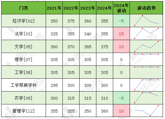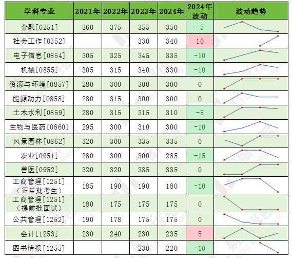 2024年专硕仅有两个专业的复试基本分数线有所上升,其中