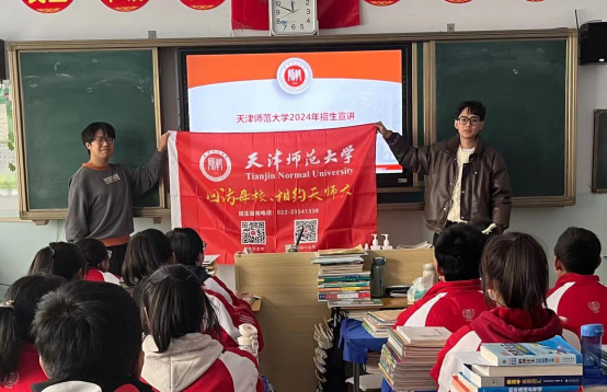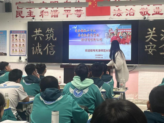 团队成员通过精心准备的照片为同学们直观的展示了天津和天师大的优美环境、地理位置、基础设施建设、师大美食等。团队成员还通过分享自身的大学经历和同学们提出的问题,由浅入深介绍了天师大的社团活动、资助政策、校园文化、往年招生情况和就业情况,重点介绍了本科生导师制,并向同学们发放了文创小礼物和宣传资料。