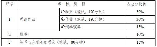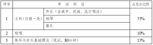 二、专业统考安排(一)音乐类1.普高音乐类(1)考试科目及分值音乐类专业考试成绩总分为300分,具体考试科目根据主科所报类别的不同,分为两种类型:①主科报考非理论作曲类考生的考试科目