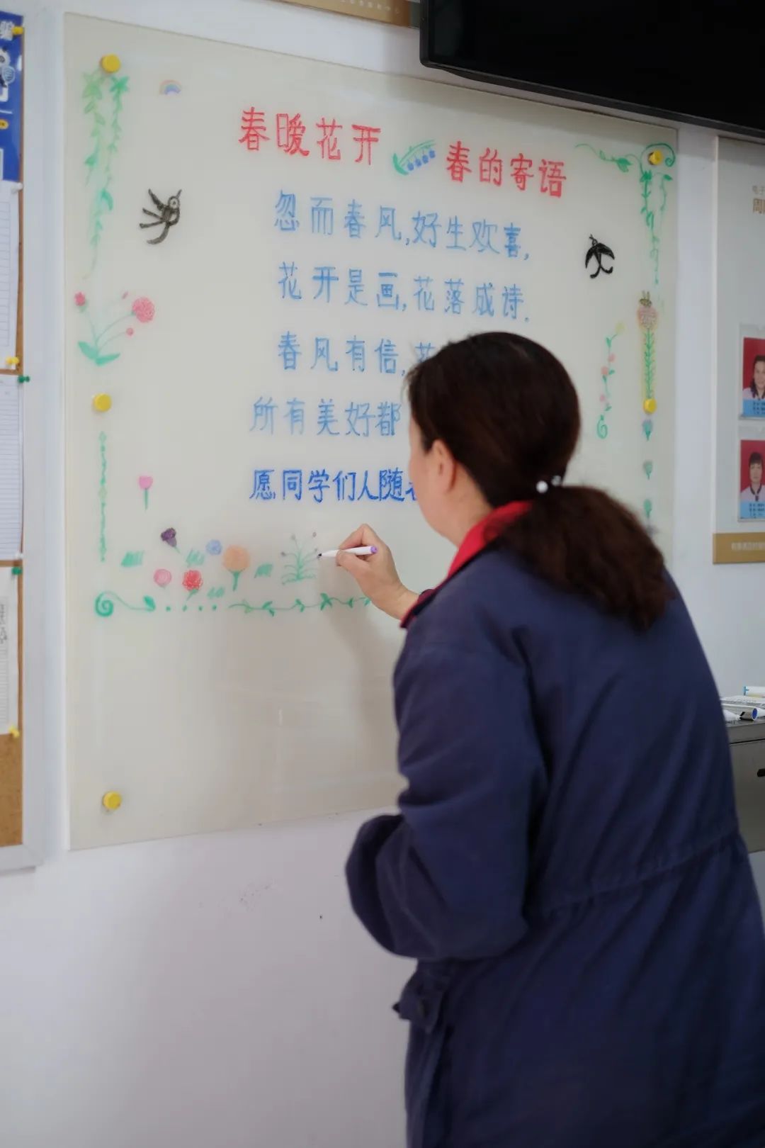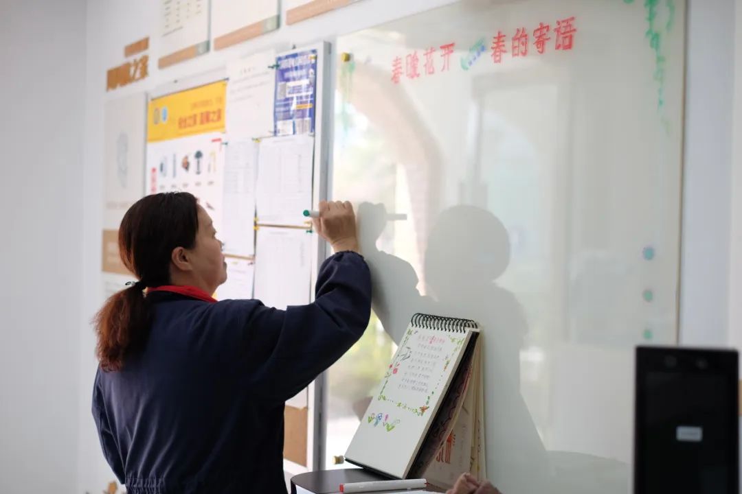 方寸之间,尽展创意。无暇的白板,自由的油笔,以及吸铁、擦板,就是朱阿姨手绘自由驰骋、让画作充满灵动情感的全部。色彩在跳跃,画笔在游走,朱阿姨用细腻的线条、深情的话语,平添着手绘的质感和魅力,传递着母亲怀抱般的爱和呵护。手绘白板,别有趣味和感动,如诗人笔下的情感,隽永的美丽画卷中蕴含着温馨。
