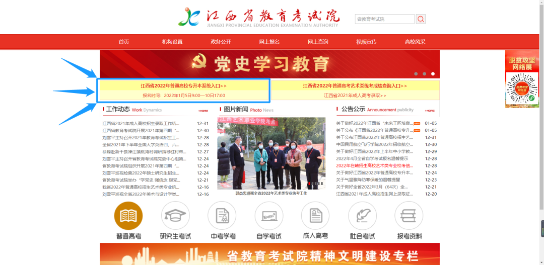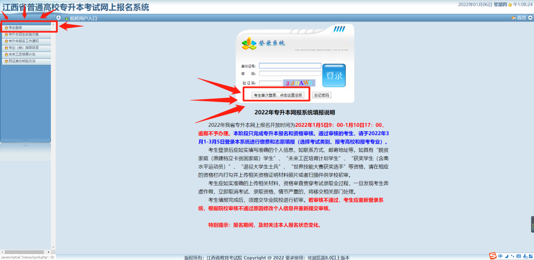 江西省2022年专升本网上报名开放时间为2022年1月5日9:00-1月10日17:00,逾期不予办理。考生登录江西省教育考试院网站“江西省2022年普通高校专升本系统入口”进行网上报名。