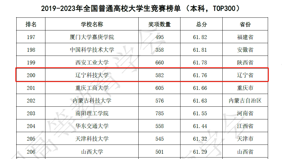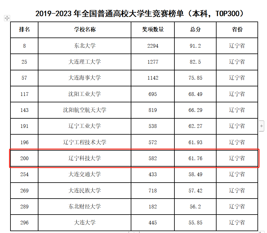 全国普通高校大学生竞赛排行榜每年发布一次,是国内第一个专注高校创新人才培养暨学科竞赛成果的排行榜。据统计,全国共有1218所本科院校纳入《2023全国普通高校大学生竞赛分析报告》,在《2019-2023年全国普通高校大学生竞赛榜单(本科,TOP300)》中,辽科大以奖项数量582项,总分61.76的成绩位列全国第200名,辽宁省第8名,相比较2022年在全国的排名上升6位。这也是学校连续4年进入全国前300名,连续3年进入辽宁省前10名。