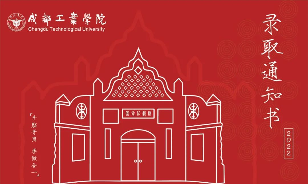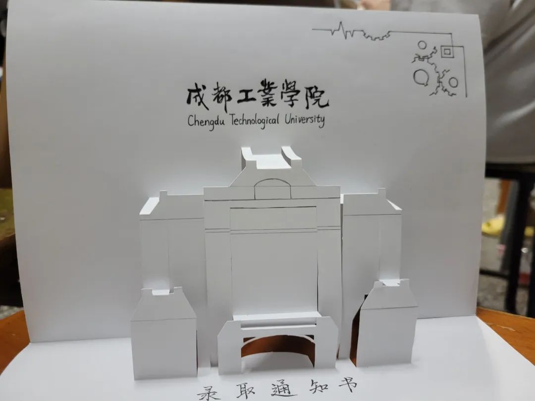 《走进成工》录取通知书。外壳信封质感采用质感红色加上烫金工艺。内部陈毅纪念馆采用镂空设计,镂空处陈毅纪念馆的大门向内推,通过折纸的方式,将大门作为力量支撑点立于录取通知书上面。