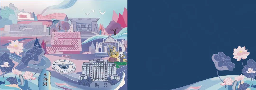当清新的简体小篆以刻印的方式和古朴典雅的米色笺纸相遇时,奇妙的韵味由此诞生。本作品以米、红、黑、白等多种简单的色调加以组合,形成了统一而又婉约的风格。外壳正面左页为学校正门剪纸风的样式,而外壳背面的左页则为学校九洲湖荷花的大体勾勒。内页同样采用古朴的米色纸张背景,与外壳的风格保持一致。