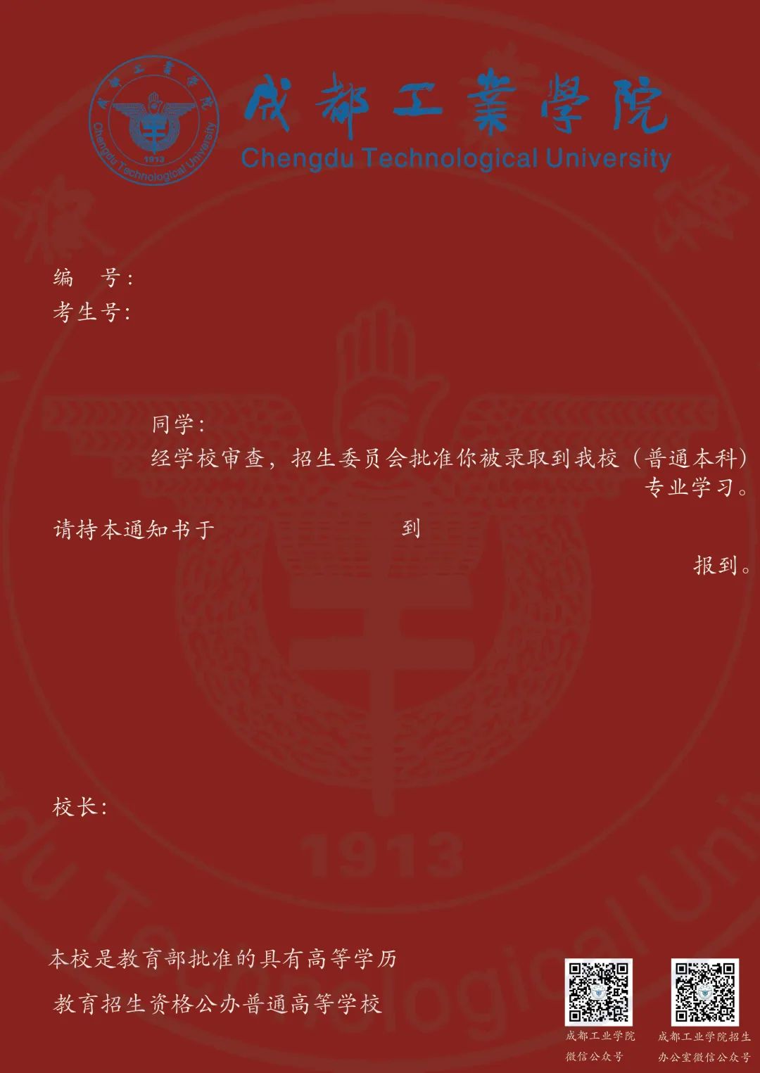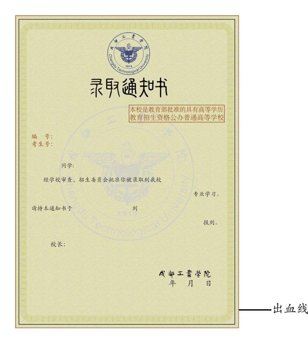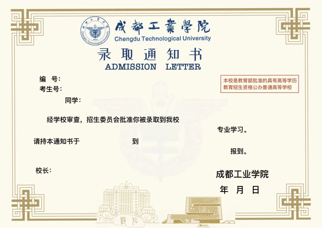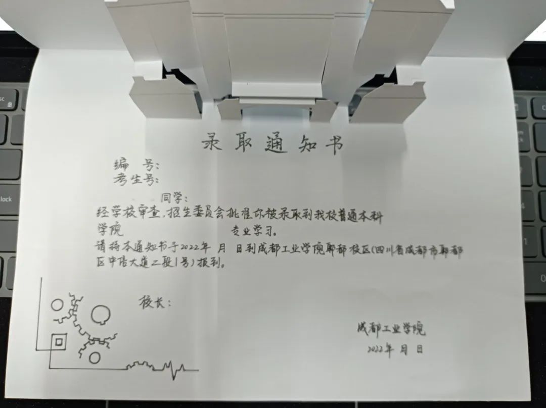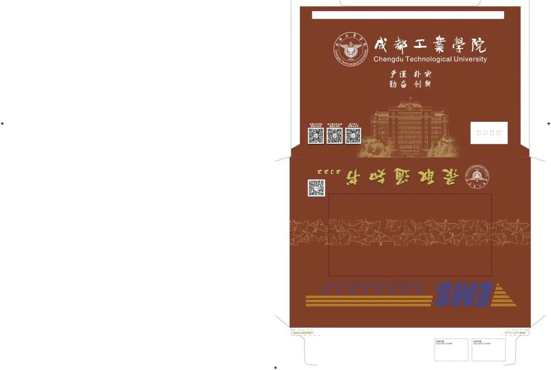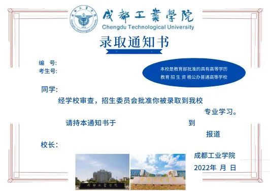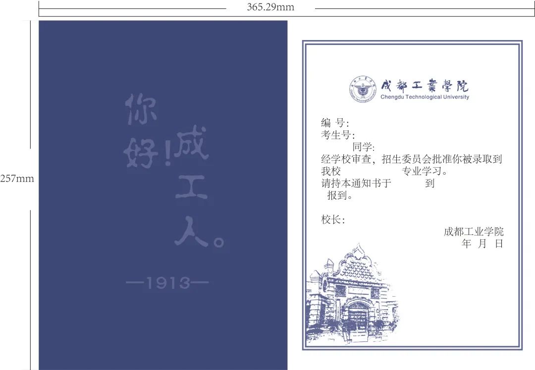 通知书正面以郫都校区建筑为简笔画主体,背面是宜宾校区建筑寓意两大校区携手并进。