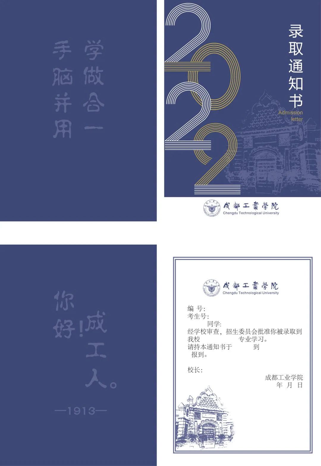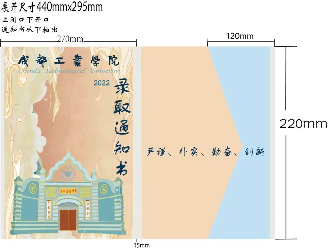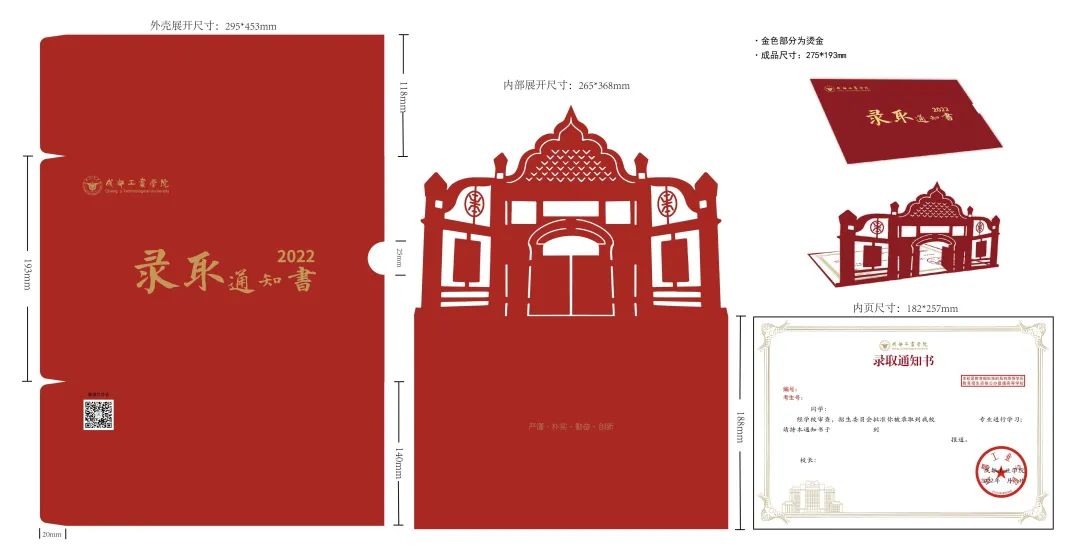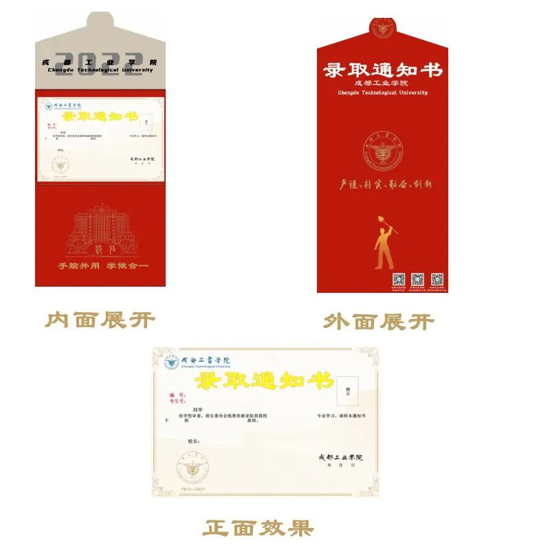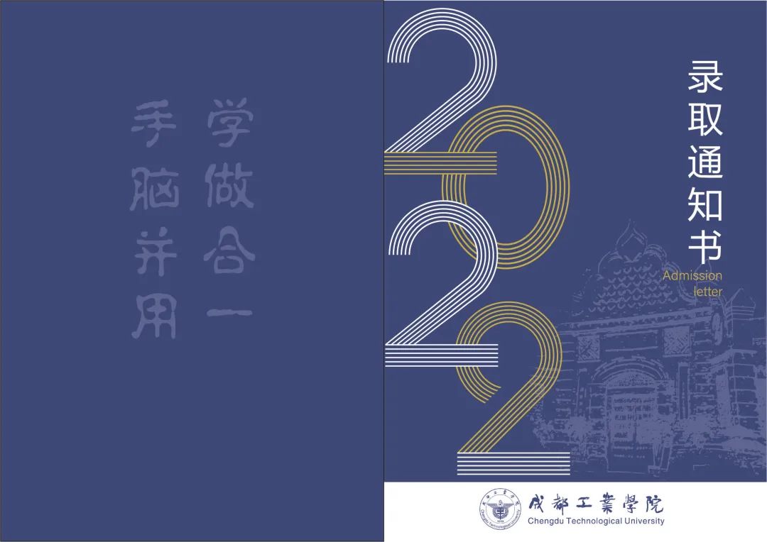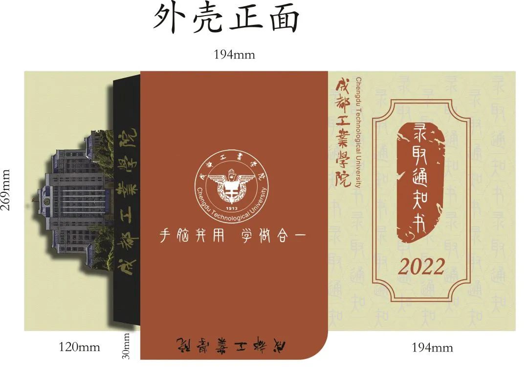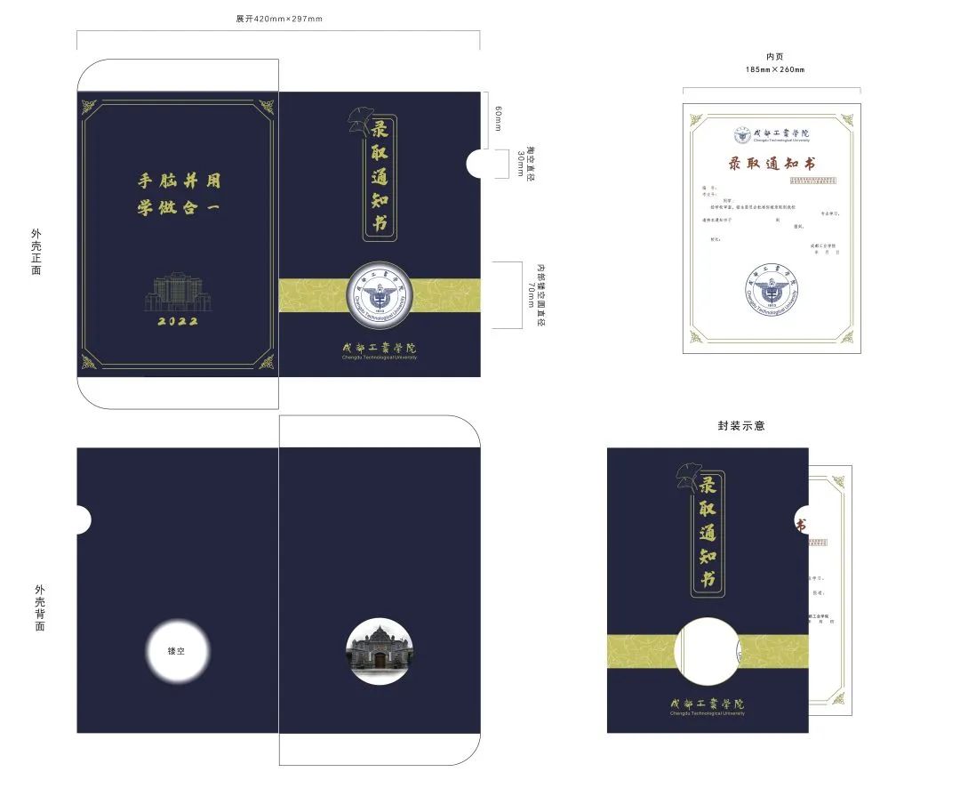 正面突出主体“录取通知书2022”,银杏底纹点缀,背面表现校名校徽以及标志性建筑,加上校风体现成工人文精神。