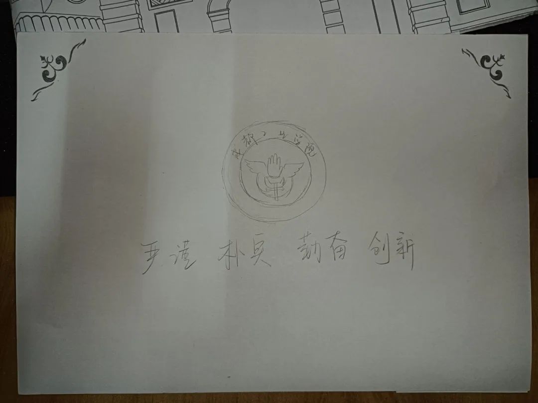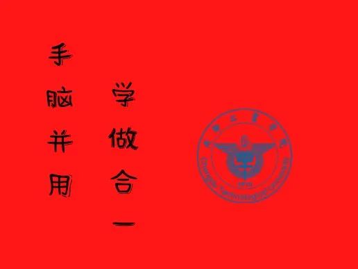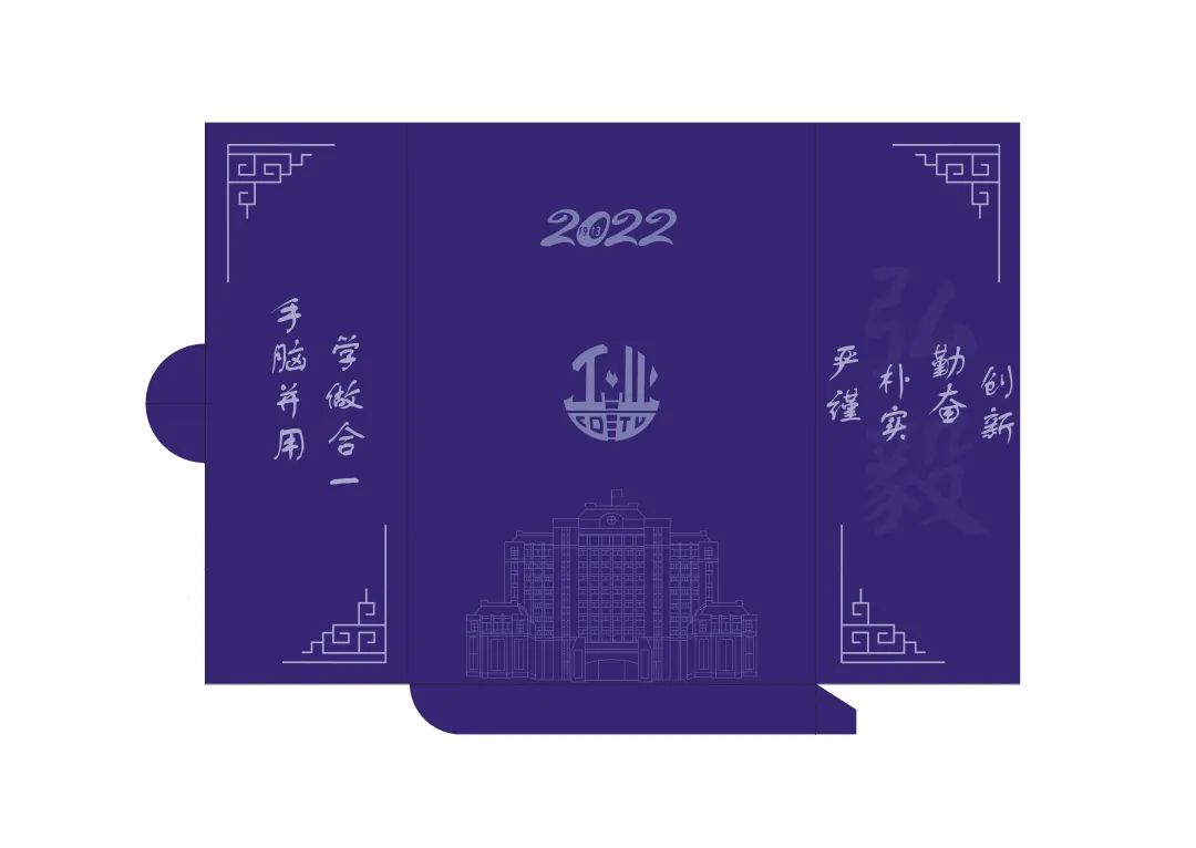 正面校徽处镂空,内页放入时露出的是内页的校徽,内页抽出时露出的是内部背面的陈毅纪念园。背面体现出校训“手脑并用,学做合一”,充分表达成工人文精神。