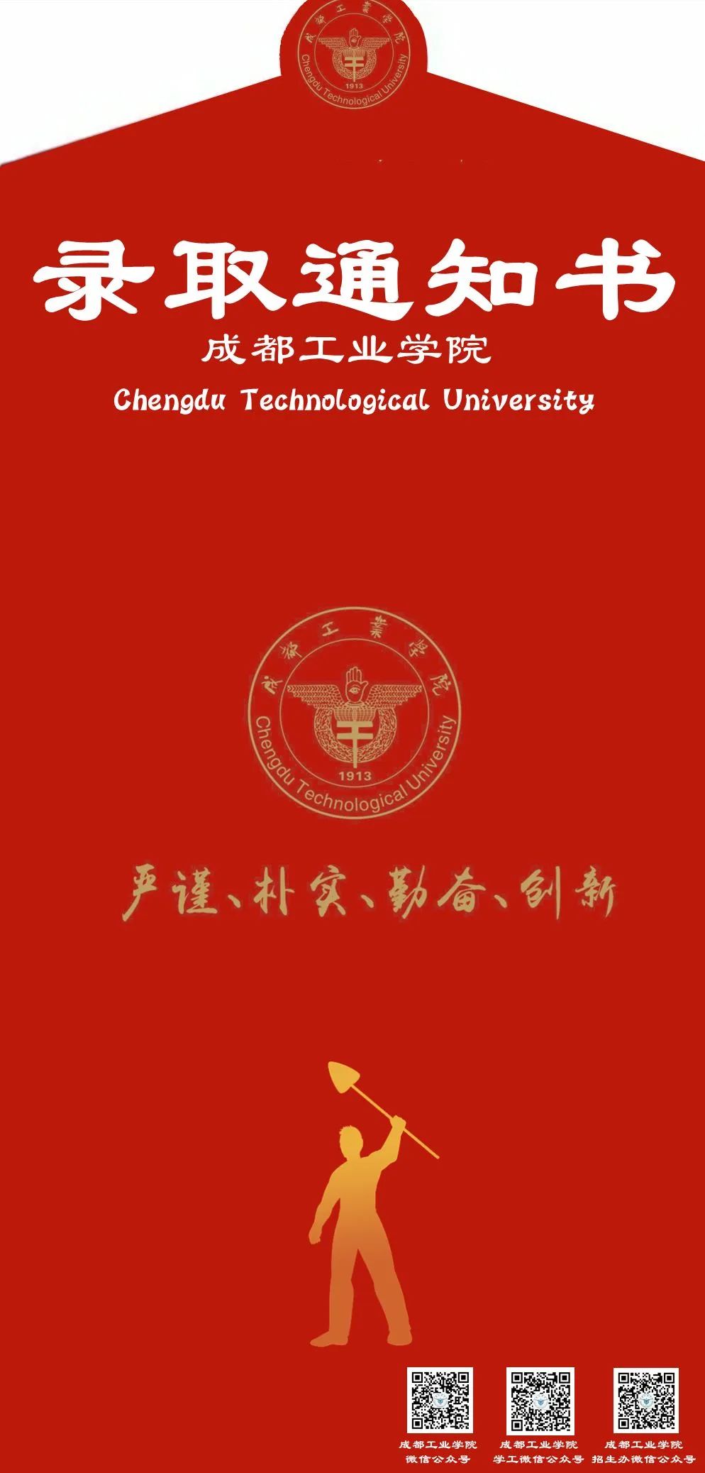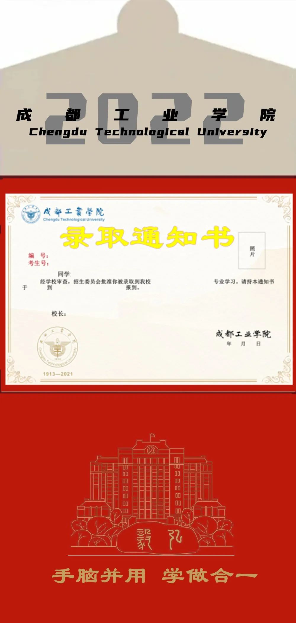 作品比较朴实无华,以拥抱成工为主题,以成工院的口号与理念与新生见面,通知书融入了成工院的标志性建筑物非常新颖独特。