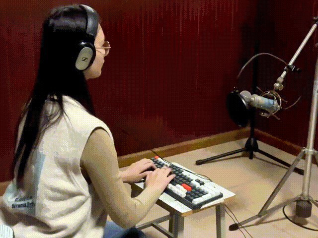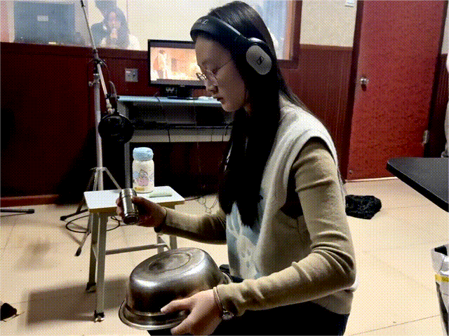 当屏幕中的演员把物品用力摔向墙面时,拟音同学拿起调味瓶敲击不锈钢盆的背面,制作出物品击打墙面的声音;当画面一转,两位演员来到电脑前修改文稿,拟音同学则用手同步敲击键盘,制作出打字的声音……