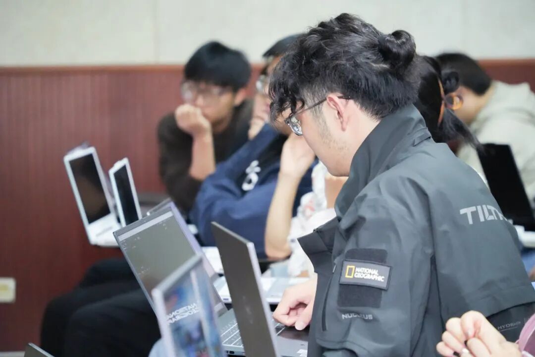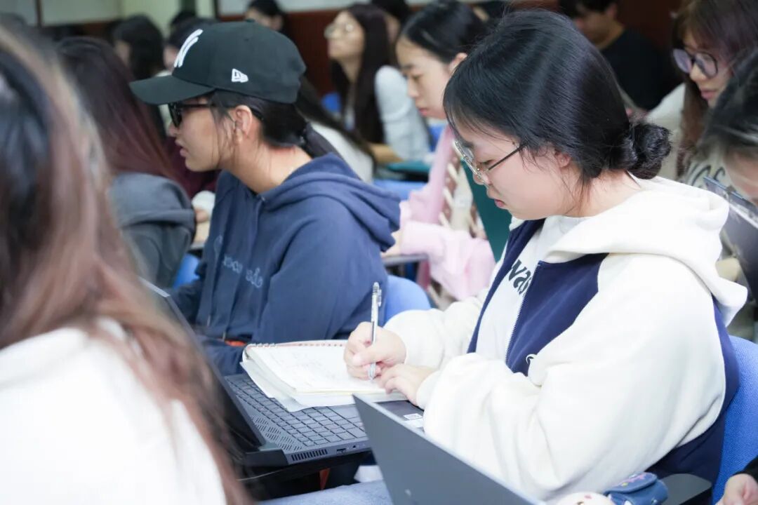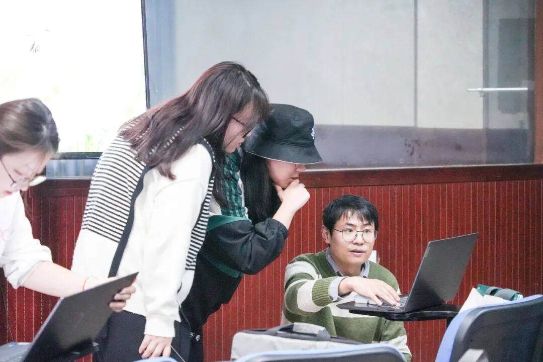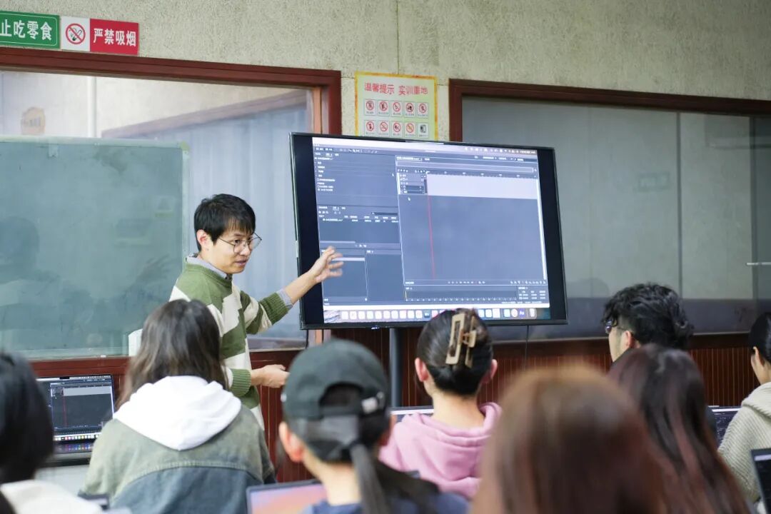 董老师在一旁观看指导,补充讲解到,台词部分的配音设计可以从人物的年龄、学历、身份背景、性格特点、行为方式和说话方式等方面着手分析,这些因素都将决定着人物独有的音色、音量、情绪、声音的饱满度,以及语气习惯等。他告诉同学们,配音过程中要将本人代入角色,学会用声音雕刻情绪,还原真实场景。