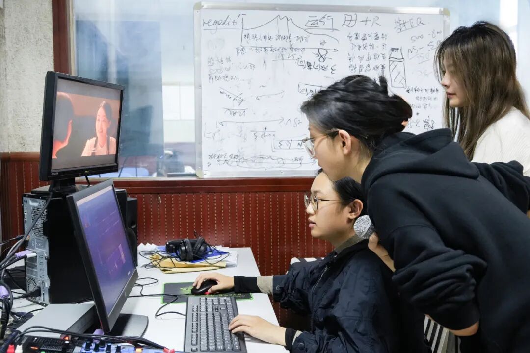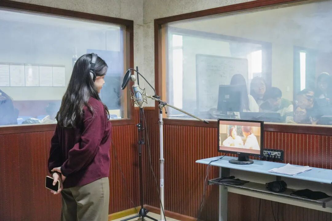 棚内的这组同学选择的影视声音片段是《你好,李焕英》。“语气中要带点含笑的感觉,声音再稍稍往回收一些。”声音导演给出信号,让配音同学调整状态,找准影视片段中的台词风格和情绪特点。